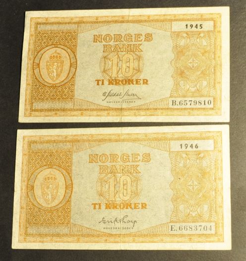 Bilder er sedlene du får. Vurder fra bilder.Begge god kv.1+. 1946 E er Thorp som har lavt opplag.. Estimert verdi ca. kr. 1900,-