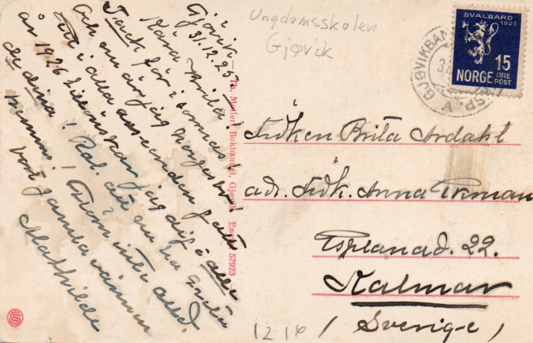 2378095: Gjøvik. Ungdomsskolen. Stmp.1925 med 15 øre Svalbard. Kval 1-2.