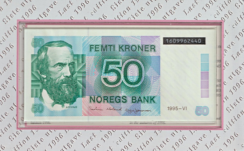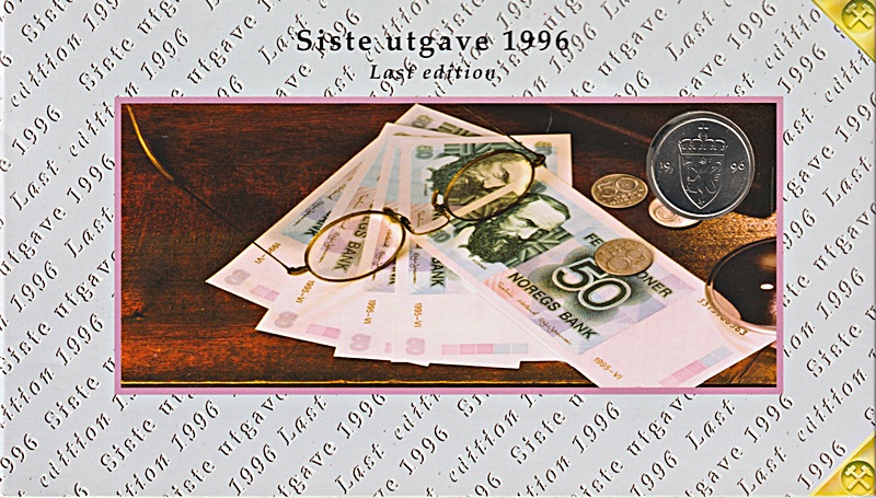 Siste utgave 1996, i folder sammen med mynt; 50 øre 1996. Utgitt av Den Kongelige Mynt.