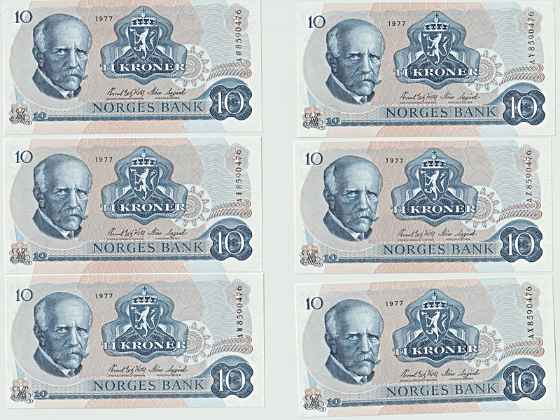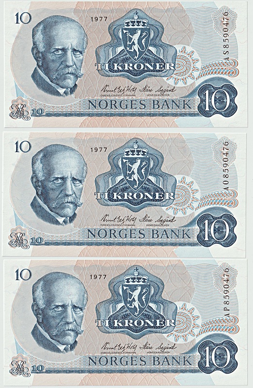 2379400: -3- Lott 9 stk. 10 kroner 1977A, samme nummer, kv. 0