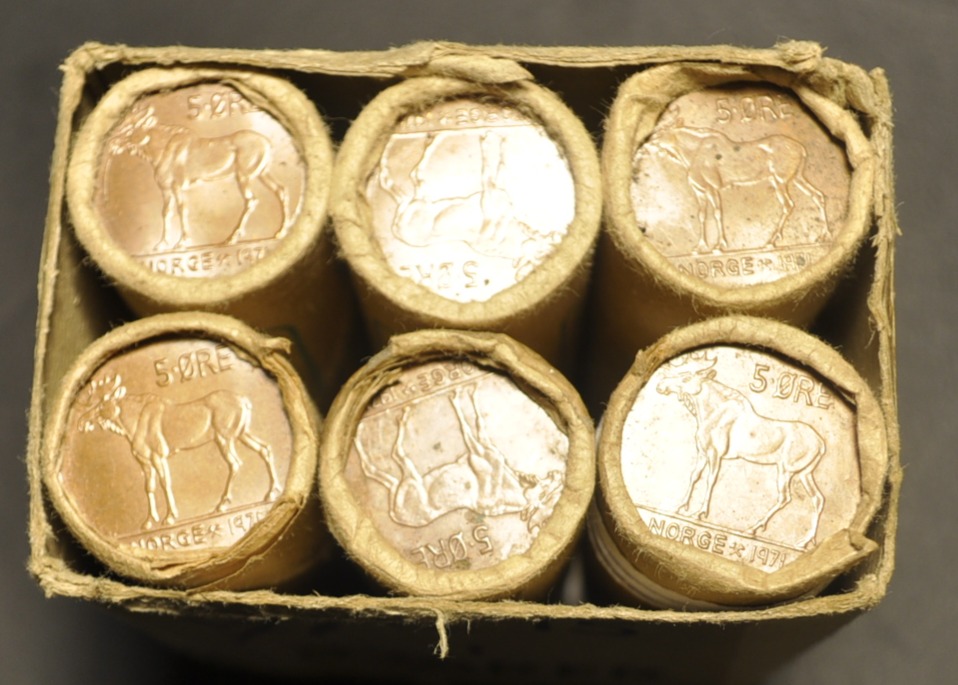 Bilder er rullene du får. Litt varierende i papiret rundt endemyntene. Vurder også fra bilder. Katalogverdi kr. 20 pr. mynt, dvs tot katverdi kr. 6000,-
