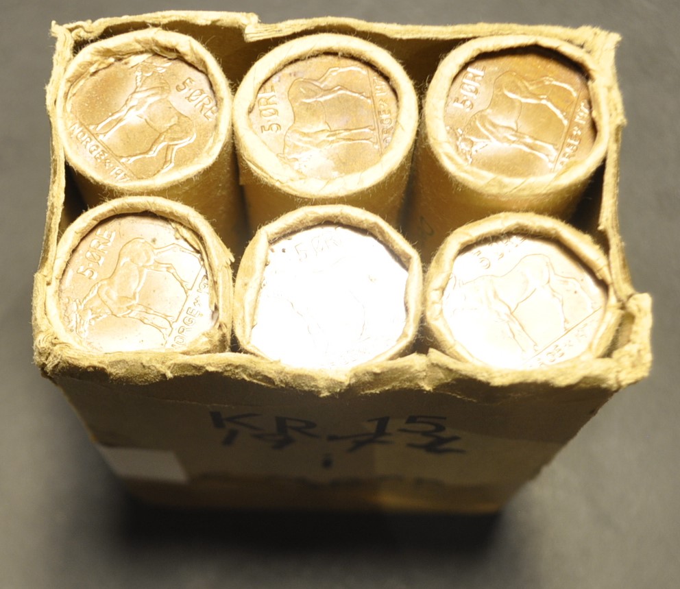 Bilder er rullene du får. Litt varierende i papiret rundt endemyntene. Vurder også fra bilder. Katalogverdi kr. 10 pr. mynt, dvs tot katverdi kr. 3000,-