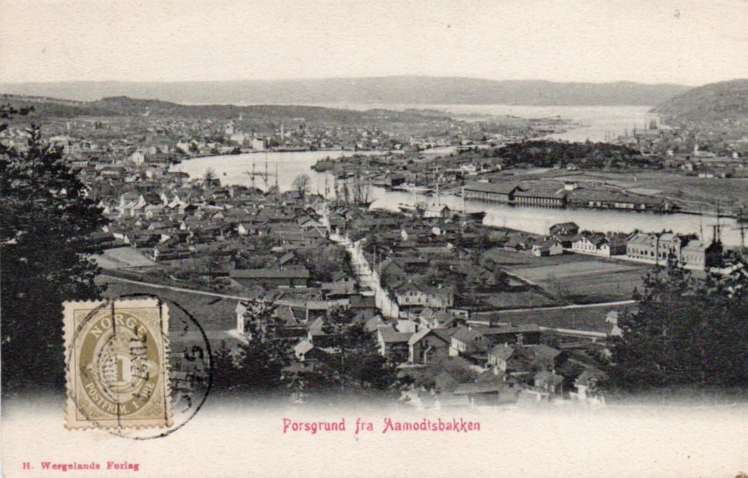 2380505: Porsgrund fra Aamodtsbakken. Frimerke foran. Udelt bakside. Kv.2.