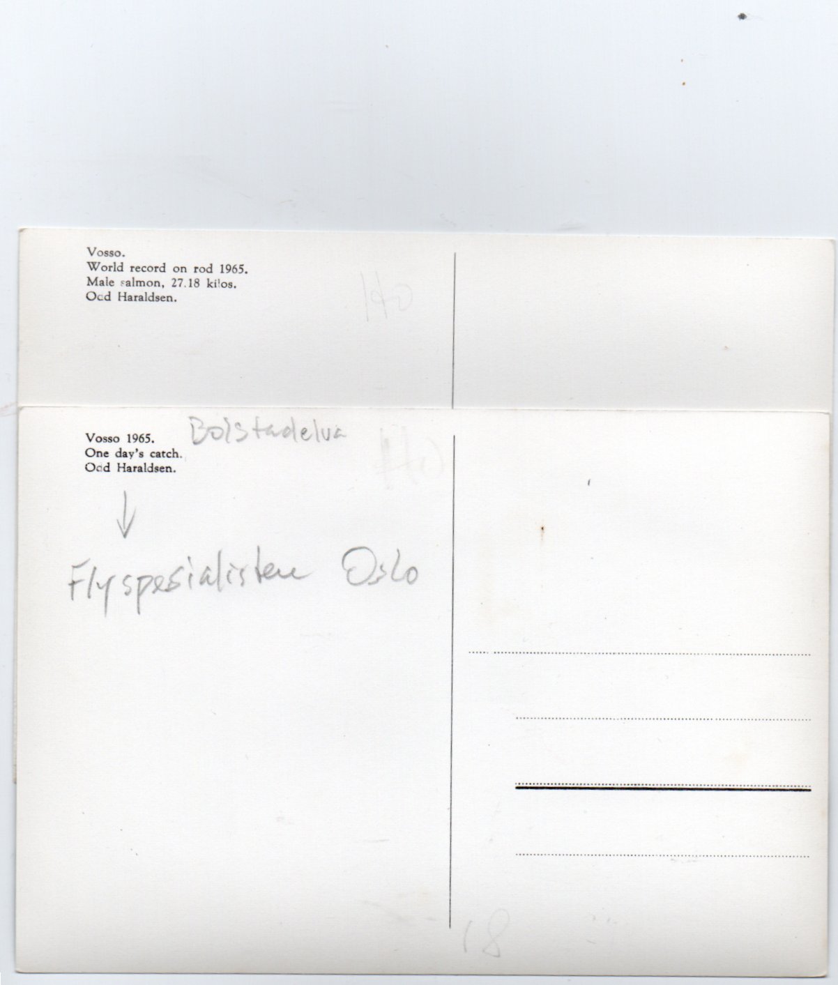Odd Haraldsen drev reisebyrået Flyspesialisten i Oslo. Se tekst oppe til venstre på kortene. Leide fiskerett i Bolstadelva i flere sesonger.