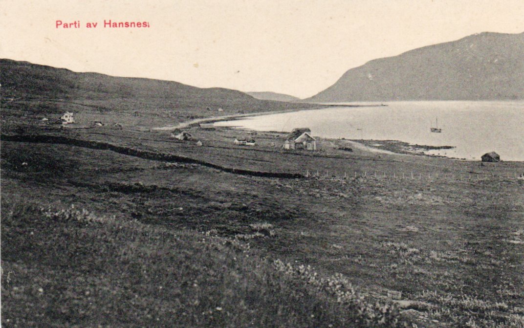 2380692: Hansnes (Karlsøy) Noen hus nær sjøen. Eneret T.H.Hoel. Ubr. Kv.2.