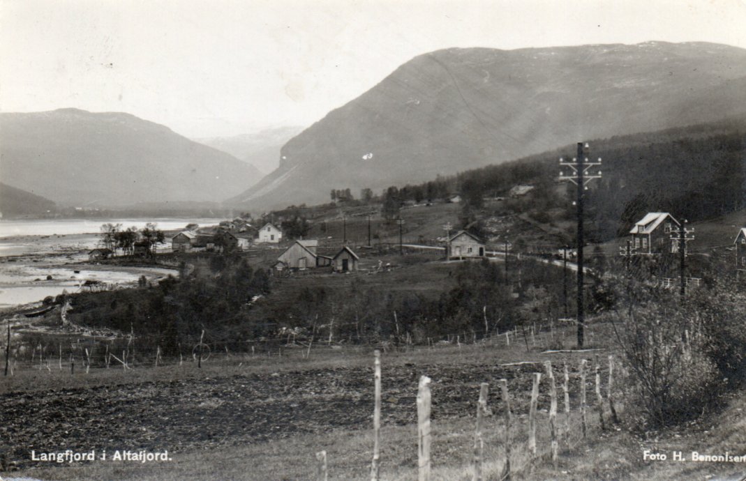 2380706: Langfjord i Altafjord med noen hus. Flott stmp.Sopnes 1937.