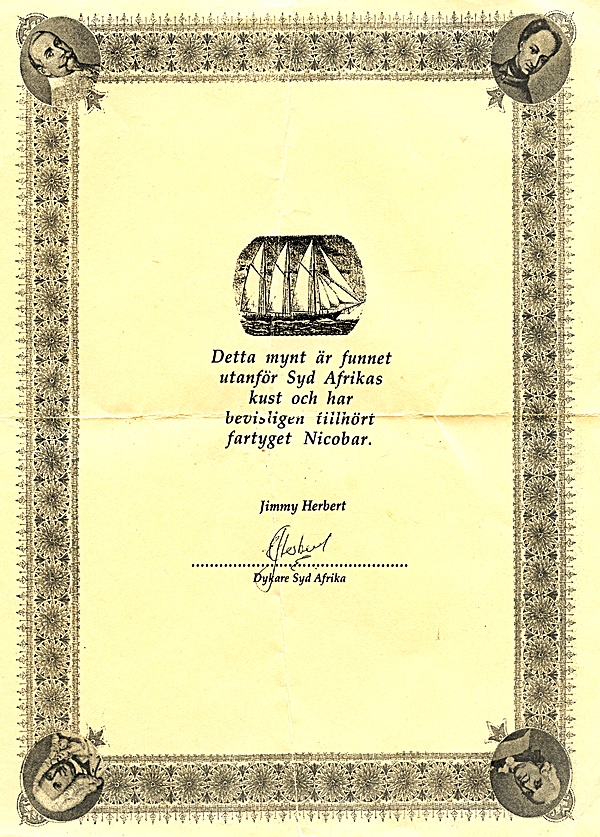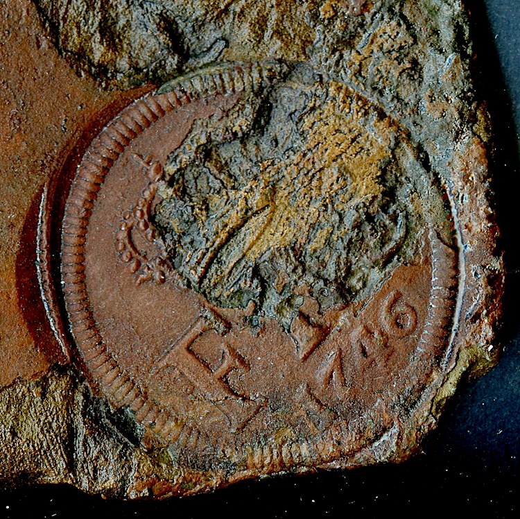 Fra vraket av Nicobar som sank 1783 og ble gjenfunnet i 1987. Kraftig korrodert; 2,4 kilo, oljet. RR mynt iflg. R.Delzanno myntårsboken 2025 s.353. Ex. Wallin Mynt.