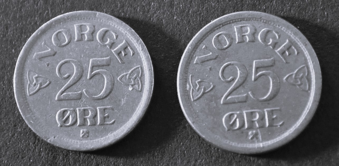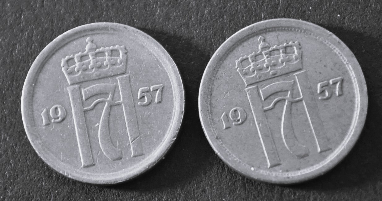 2381738: 25 øre 1957 på og uten plate. Begge ca kv.01.