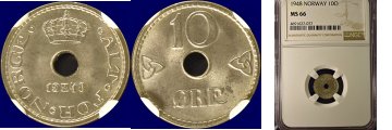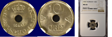 -1- 10 øre 1947 i NGC-slabb, kv. MS 66 (Norway after 1874) v | 10 | 28/11 17:05:00 | NOK 129,- |