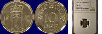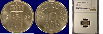-4- 10 øre 1955 i NGC-slabb, kv. MS 66 (Norway after 1874) v | 7 | 28/11 17:08:00 | NOK 321,- |