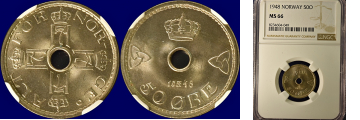-5- 50 øre 1948 i NGC-slabb, kv. MS 66 (Norway after 1874) v | 10 | 28/11 17:09:00 | NOK 195,- |