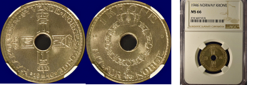 -6- 1 krone 1946 i NGC-slabb, kv. MS 66 (Norway after 1874) v | 7 | 28/11 17:10:00 | NOK 501,- |