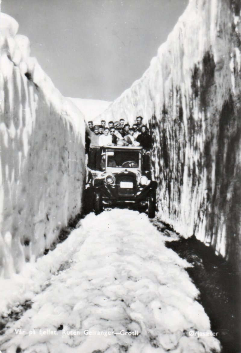 2378281: Geiranger-Grotli. Buss mellom høye brøytekanter. Ubr. Kval 1-2.