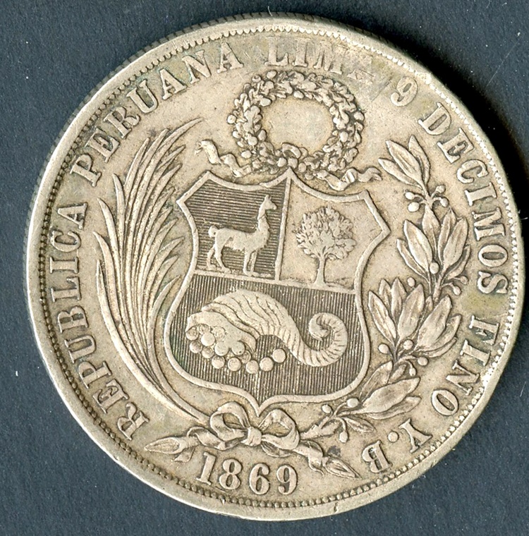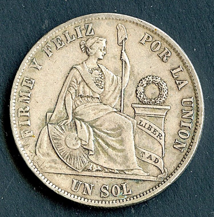 2378326: -4- Peru 1 Sol 1869, kv. 1/1+, delvis svakt preg..