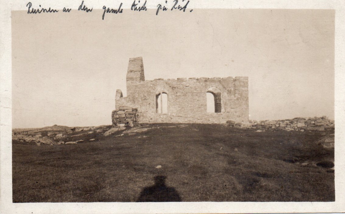 2378438: Røst. Ruiner av den gamle kirken på Røst. Påskr.1928. Kval.2.