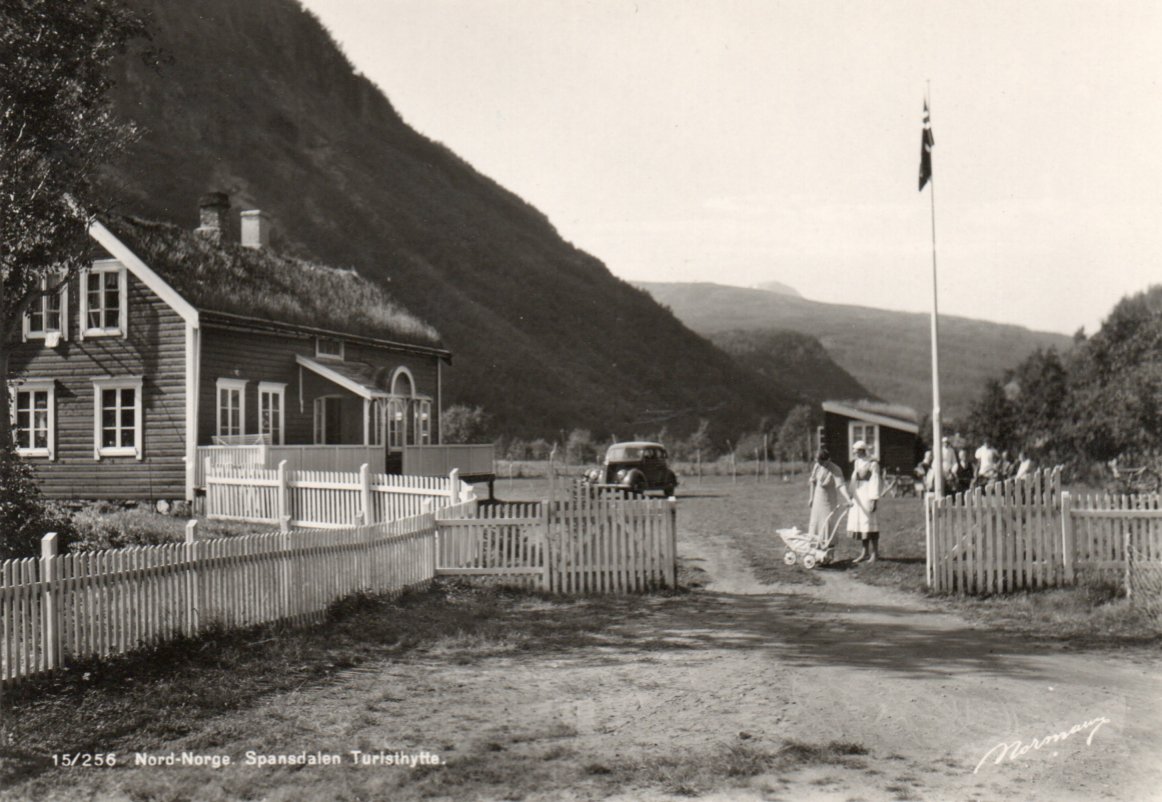 2378449: Spansdalen Turisthytte. Bil og folk. Ubr. Kval 1-2.