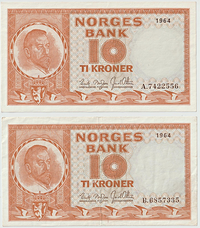 2379398: -1- Lott 2 stk. 10 kroner 1964 A&B, VK
