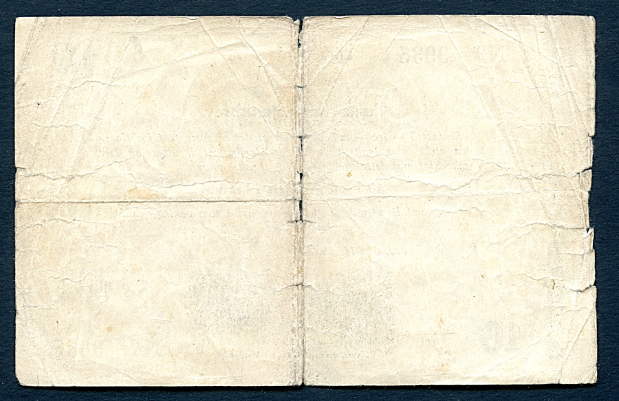 S-seddel ifølge K. Sæthres siste Norske Pengesedler 2022. Store bretterifter oppe og nede, rifter på kortsidene og noe papirmangel på midt. Lukefyller.