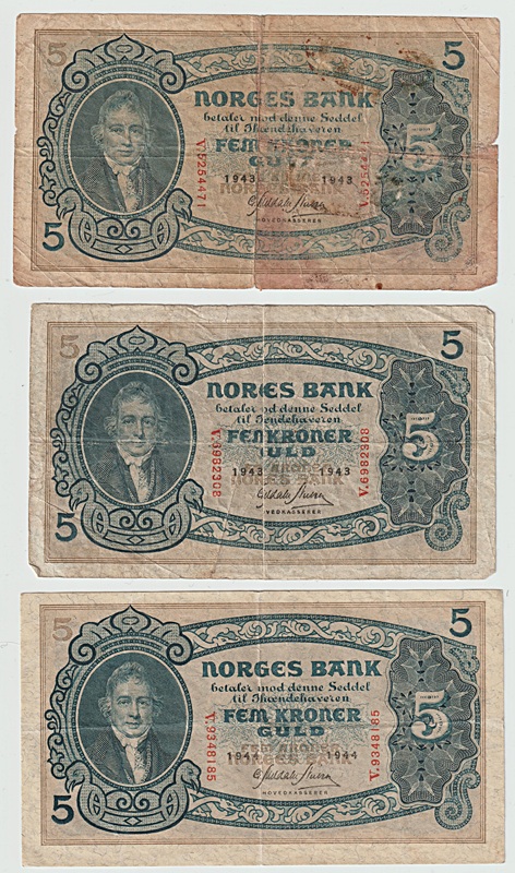 2380124: -10- Lott 3 stk. 5 kroner 1943-1944, VK
