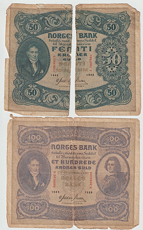 50 kr. 1943C, kv. 3 (Todelt) & 100 kr. 1939B, kv. 1-/2, bretter, rifter.